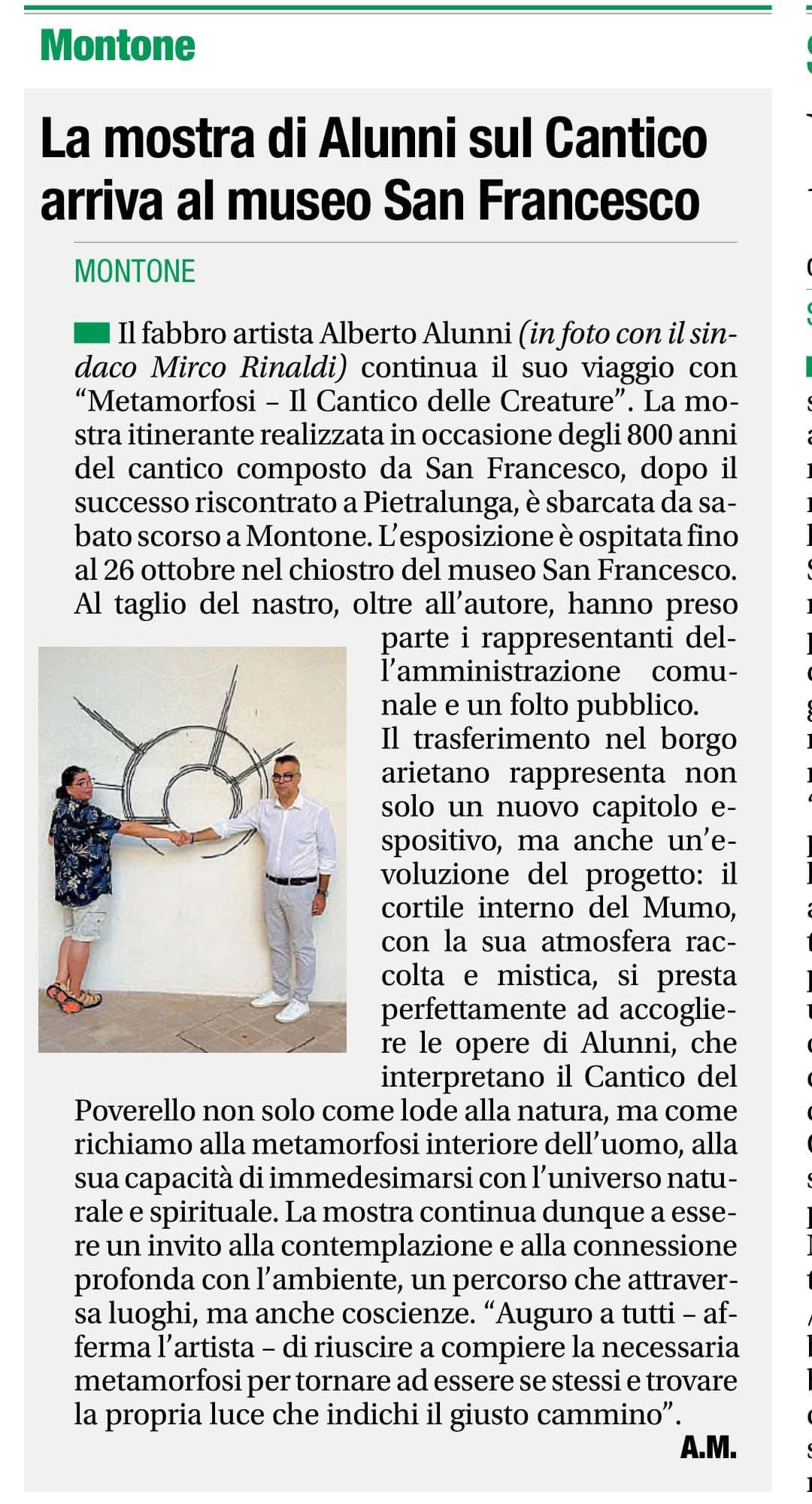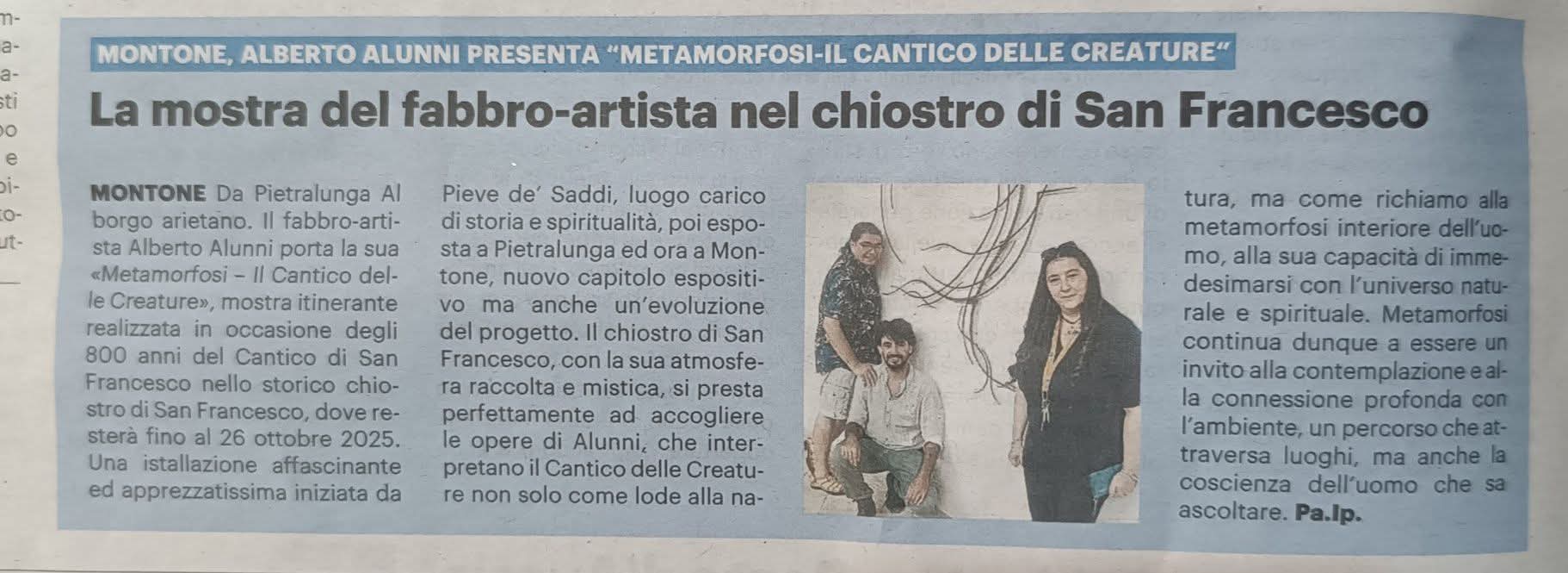 Nel 2025 ricorrono gli 800 anni del Cantico delle Creature, un inno alla natura, alla bellezza del creato, alla trasformazione. Un messaggio che sento vicino al mio modo di vivere e di creare. Per questo ho voluto rendergli omaggio con una mostra che ho chiamato “Metamorfosi – Il Cantico delle Creature”. Il ferro, sarà il mio linguaggio per raccontare la metamorfosi della natura e dell’anima. Come Francesco ha saputo vedere la bellezza e la sacralità in ogni elemento del creato, così io cerco di dare forma a questa visione, intrecciando le energie della mia terra con la materia viva delle mie opere.